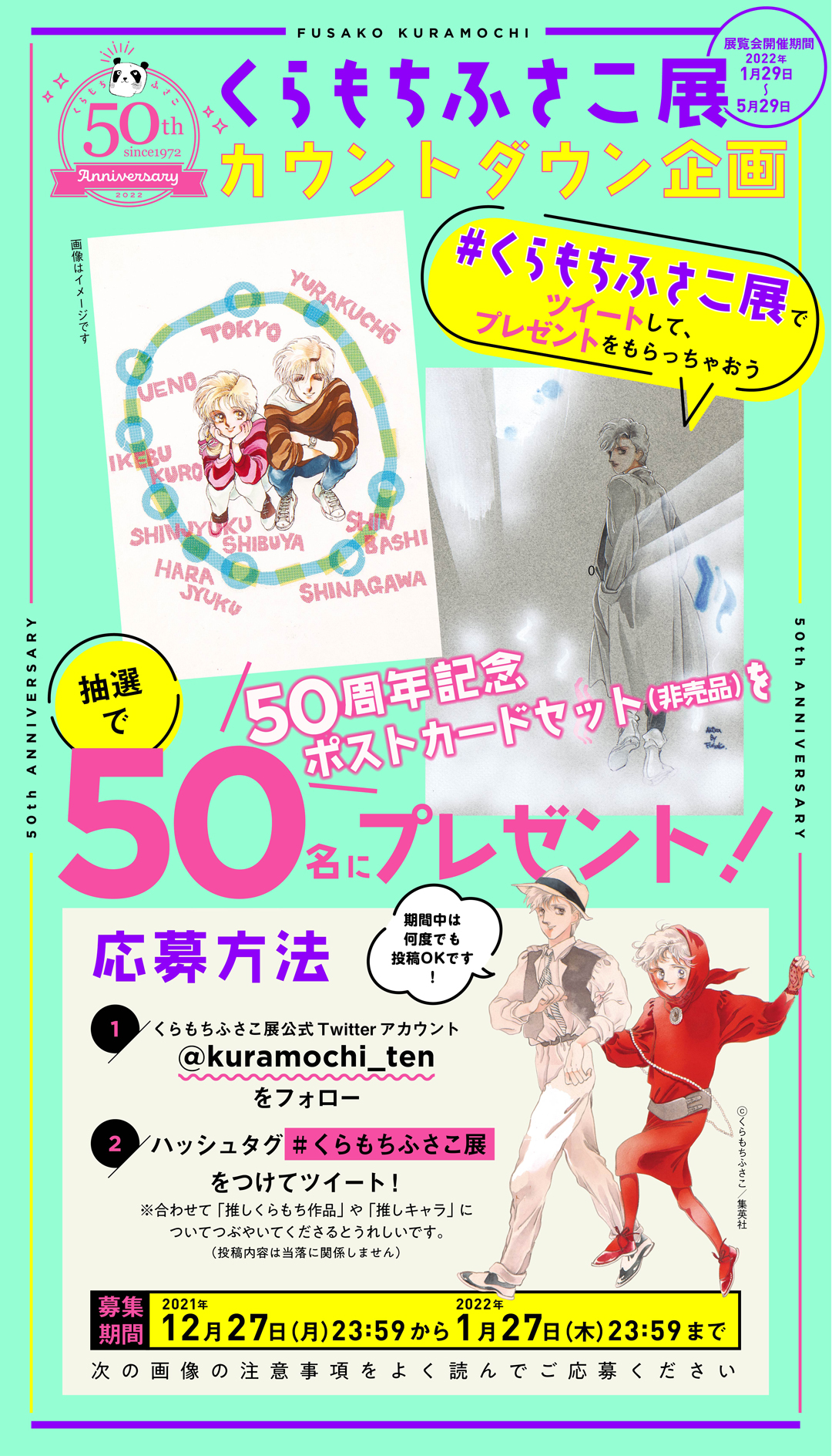 くらもちふさこ50th情報局 このアカウントをフォローし ハッシュタグ くらもちふさこ展 をつけて期間内にツイートしてくださった方の中から抽選で 特製ポストカードをプレゼント くらもち作品への愛や思い出をつぶやいてくださいね おひとり様何度